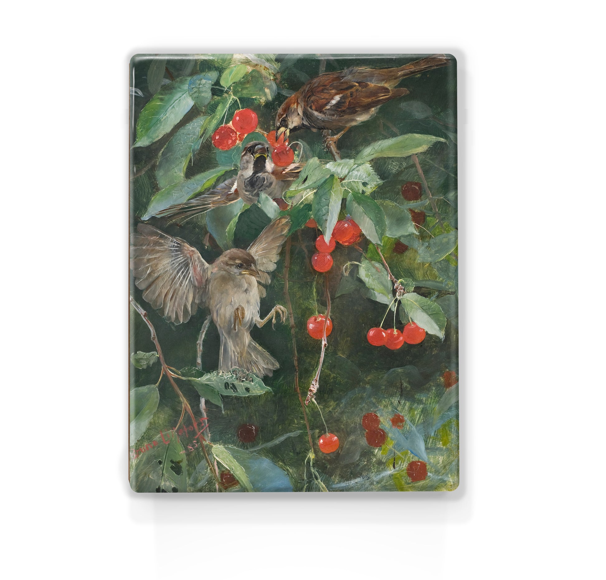 Laque print painting " Sparrows in a cherry tree "