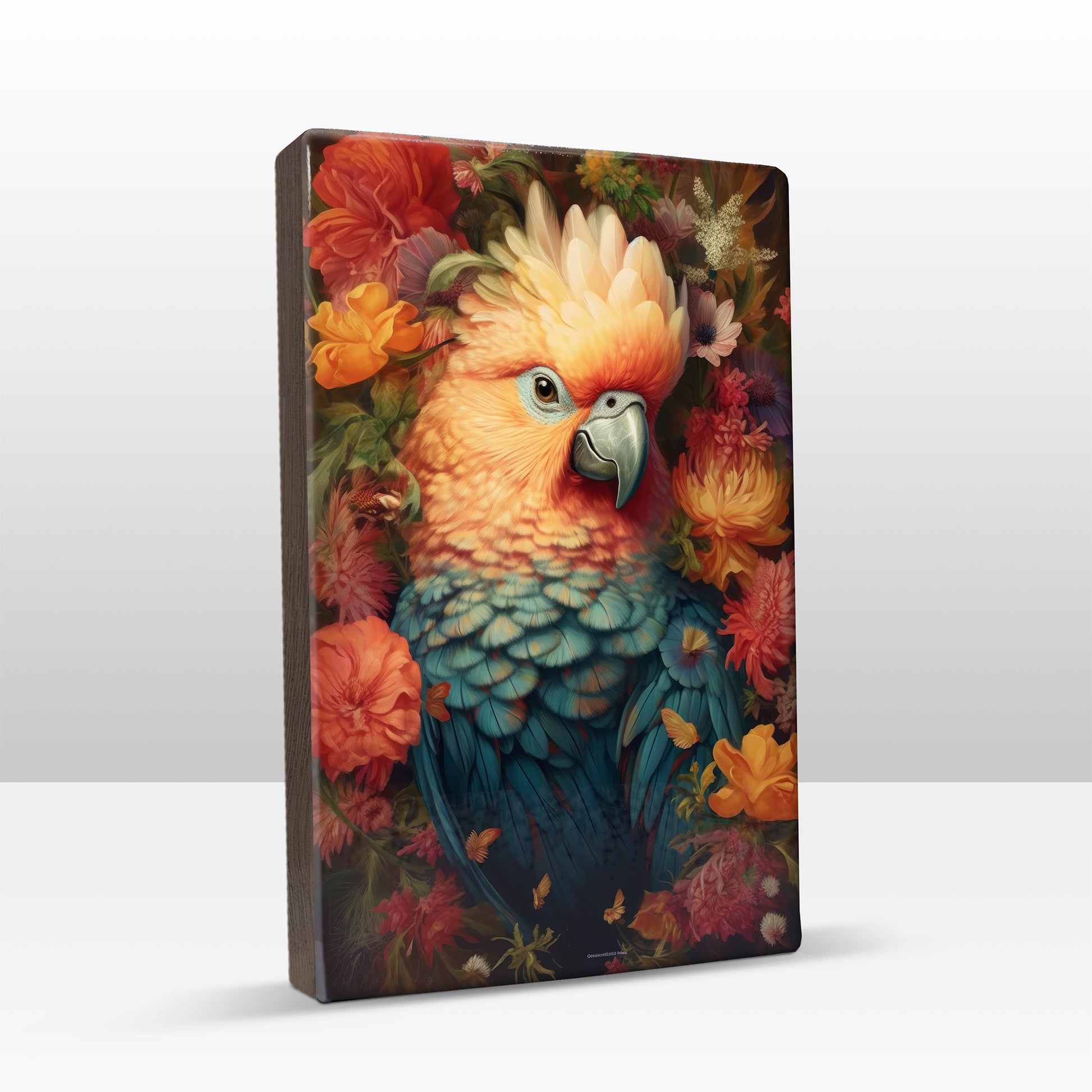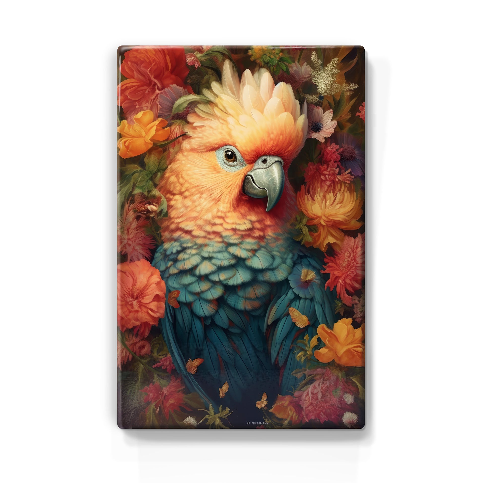 Blauwe papegaai met bloemen 1 - Laqueprint - 19,5 x 30 cm - LP336