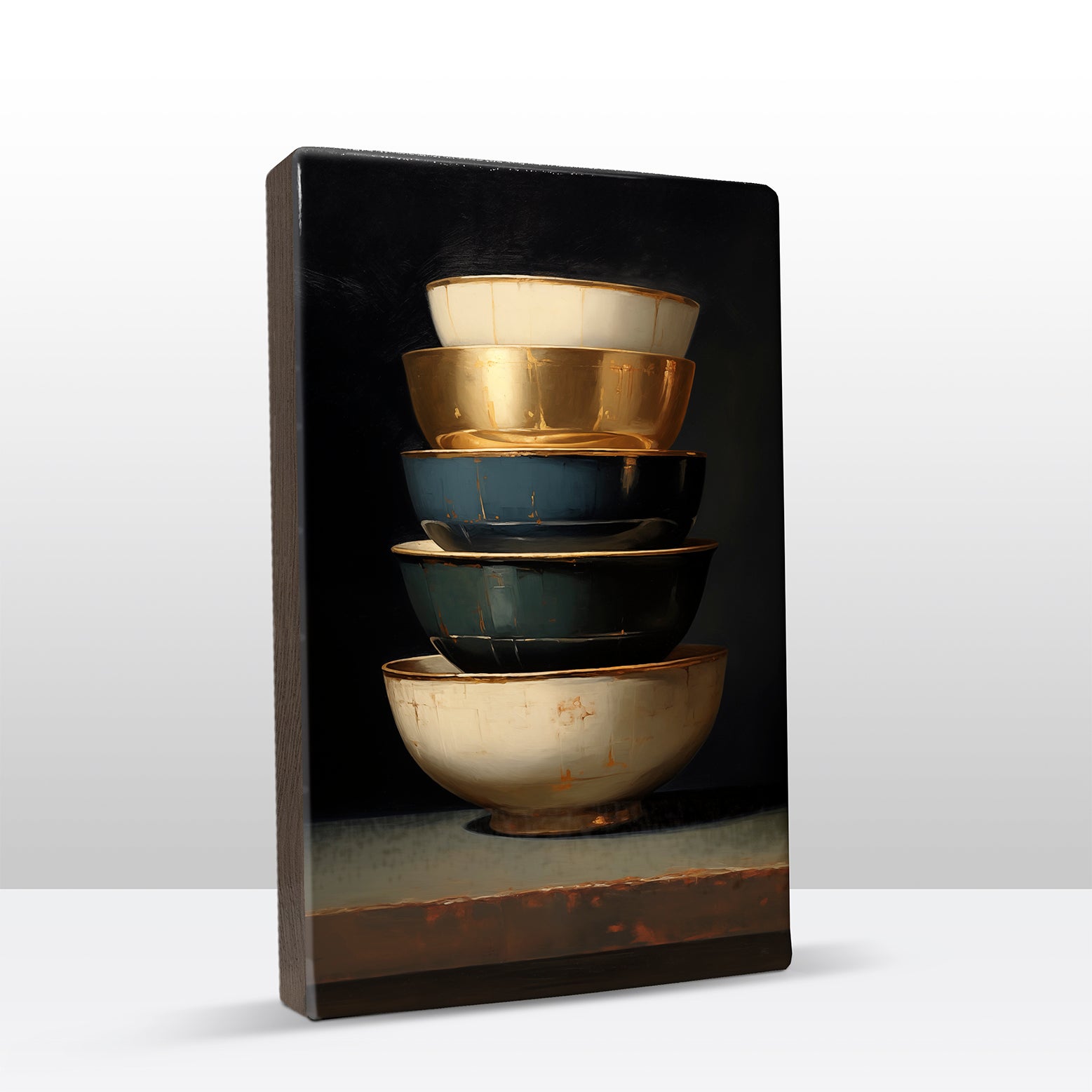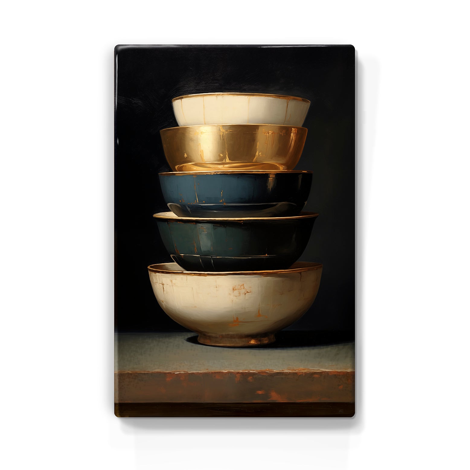 Laqueprint schilderij "Stapel kommen Goud - Blauw 2"