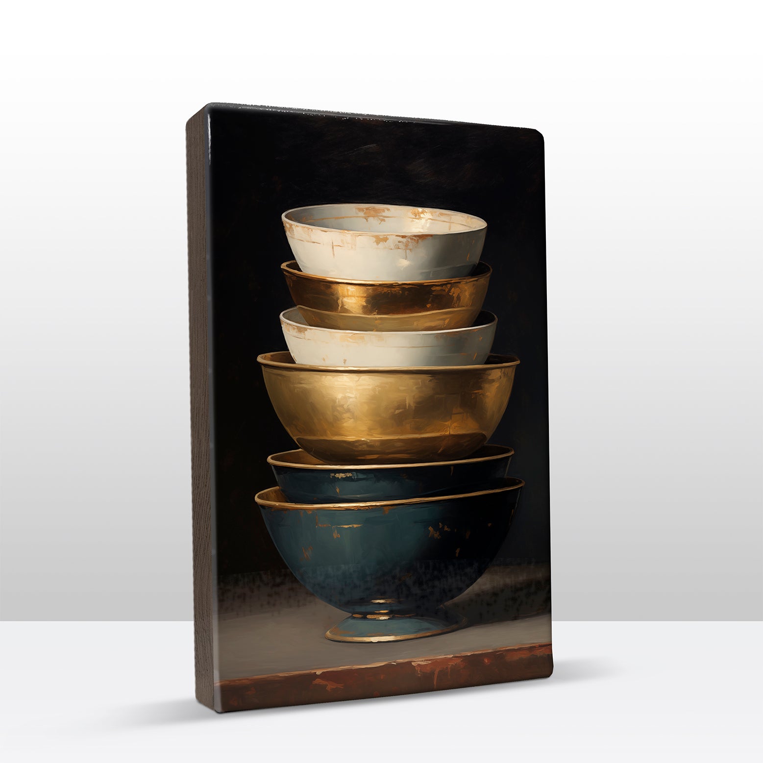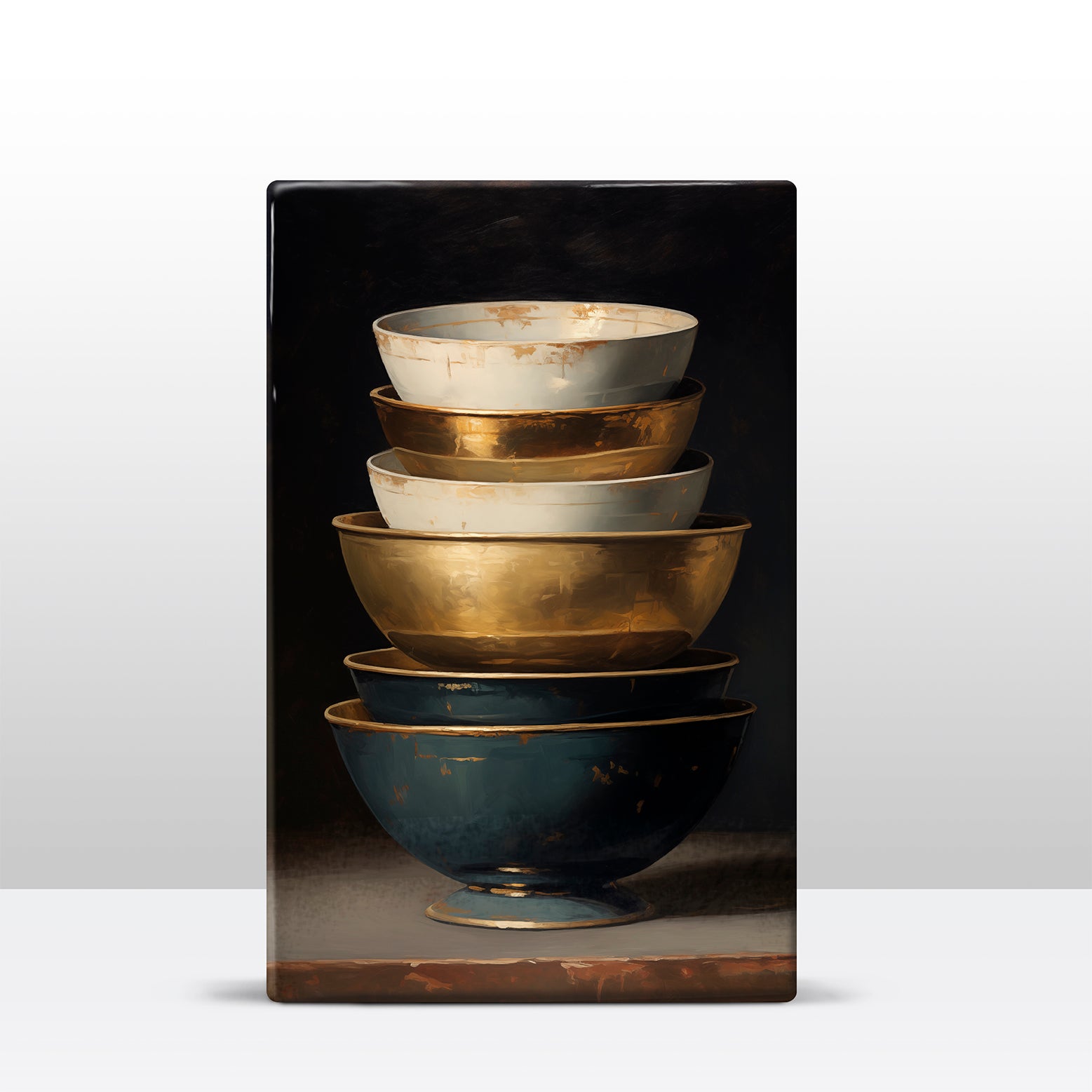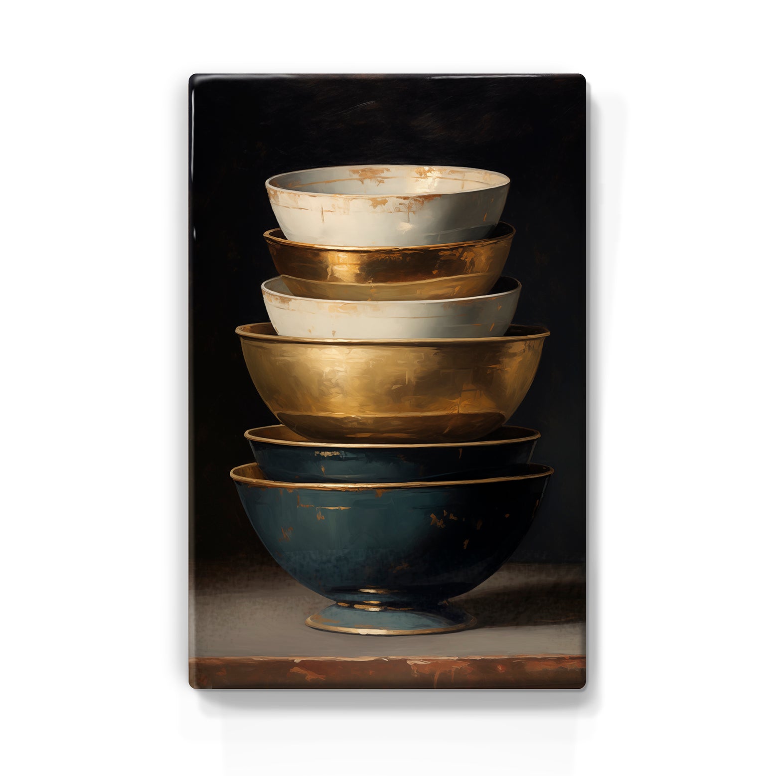Laqueprint schilderij "Stapel kommen Goud - Blauw 1"