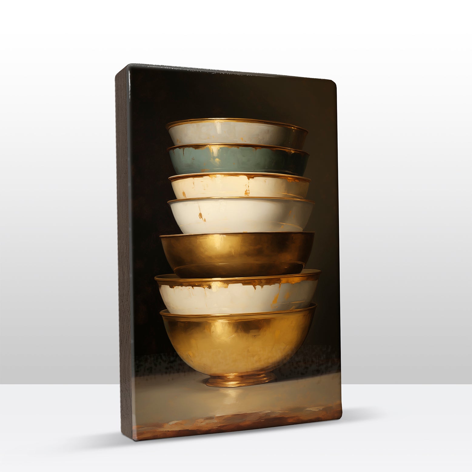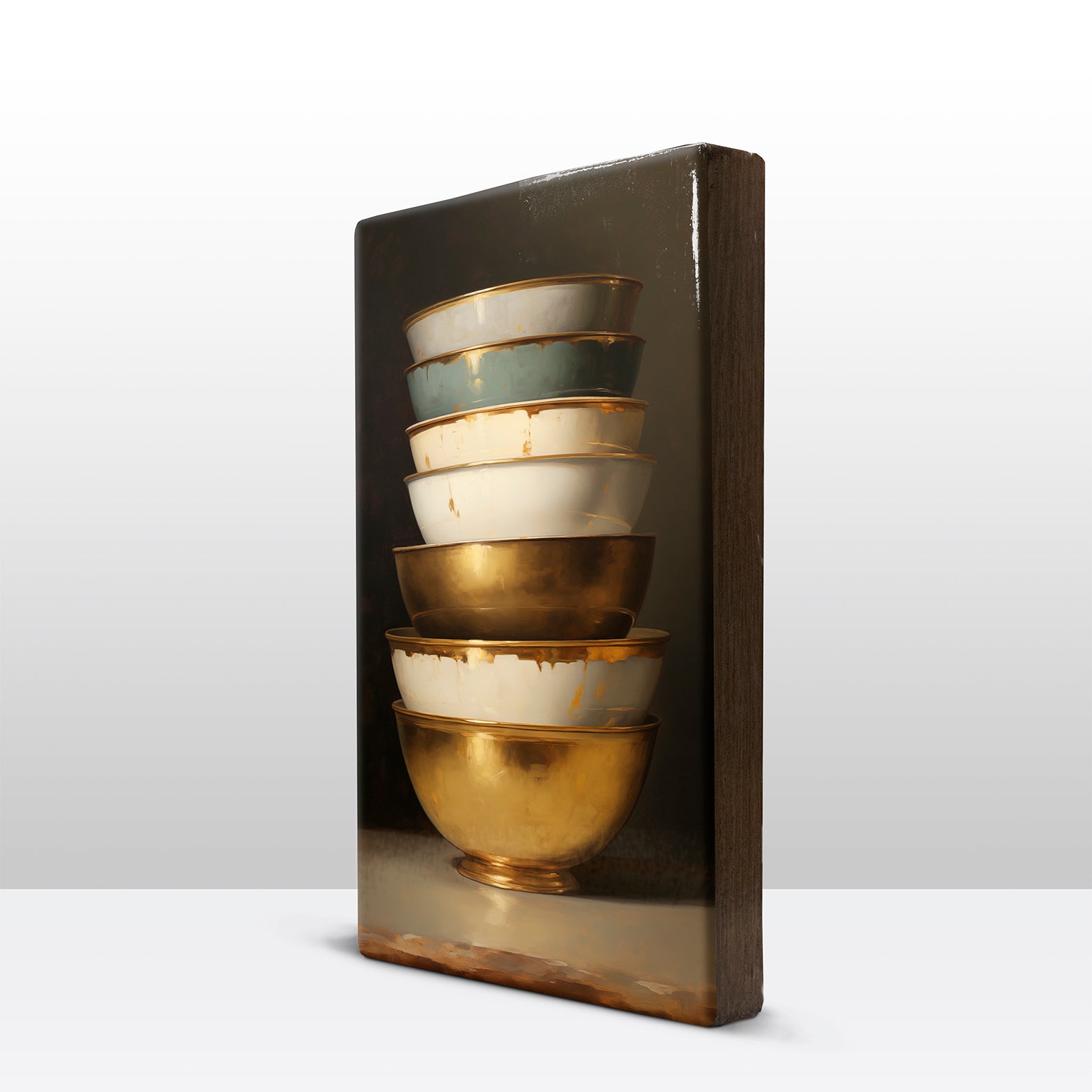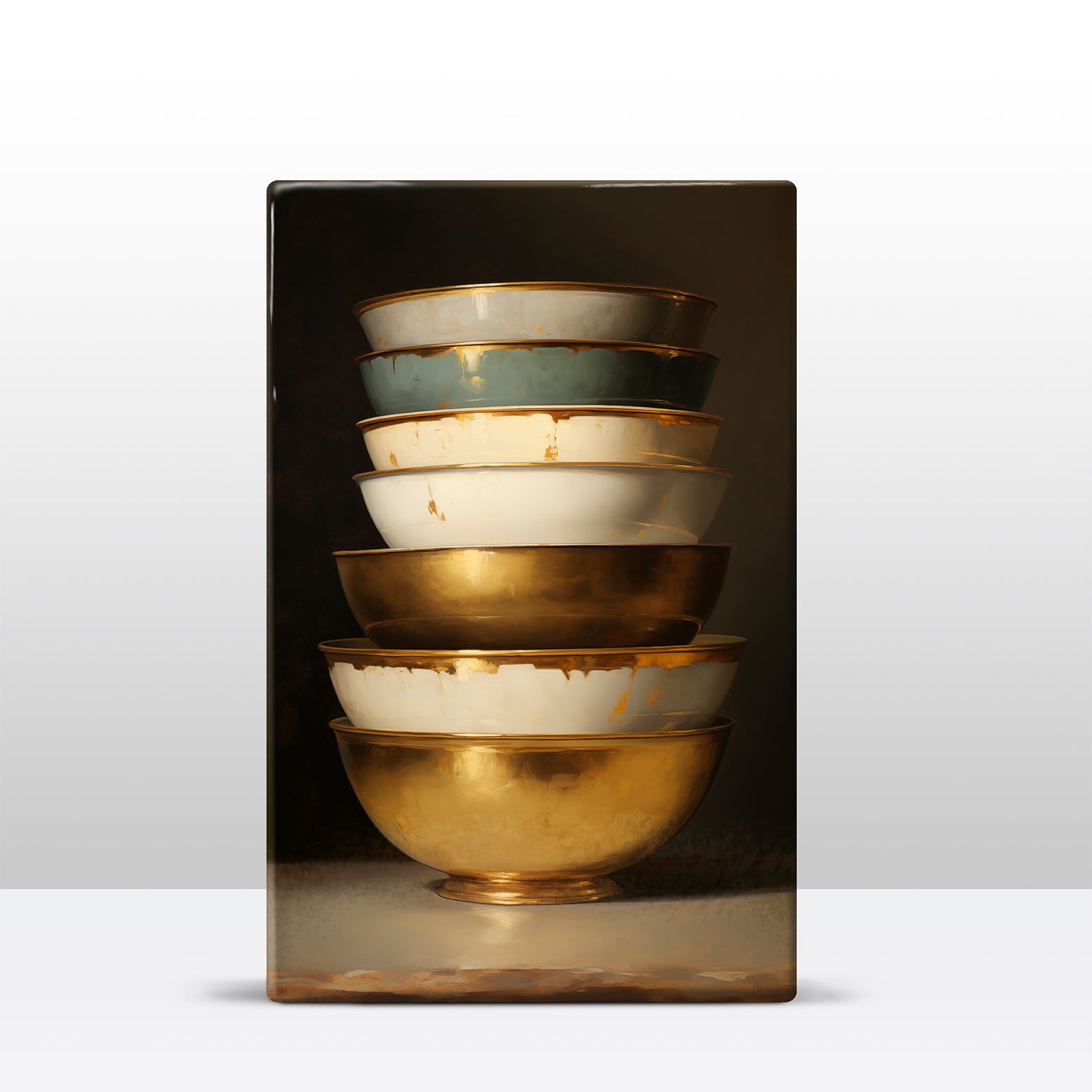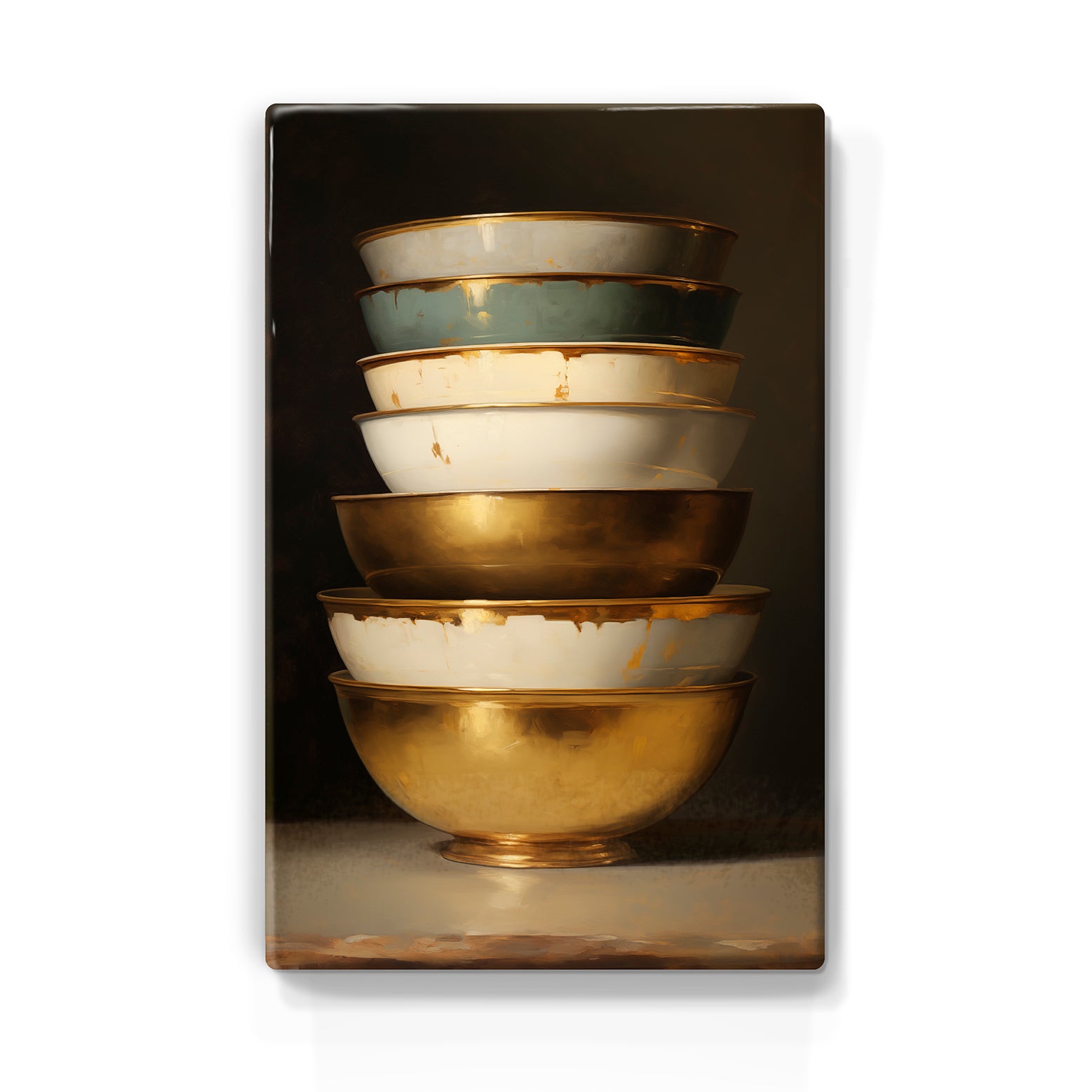 Laqueprint schilderij "Stapel kommen Goud - Wit 1"
