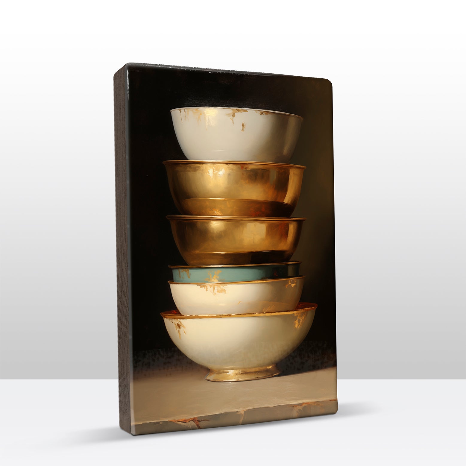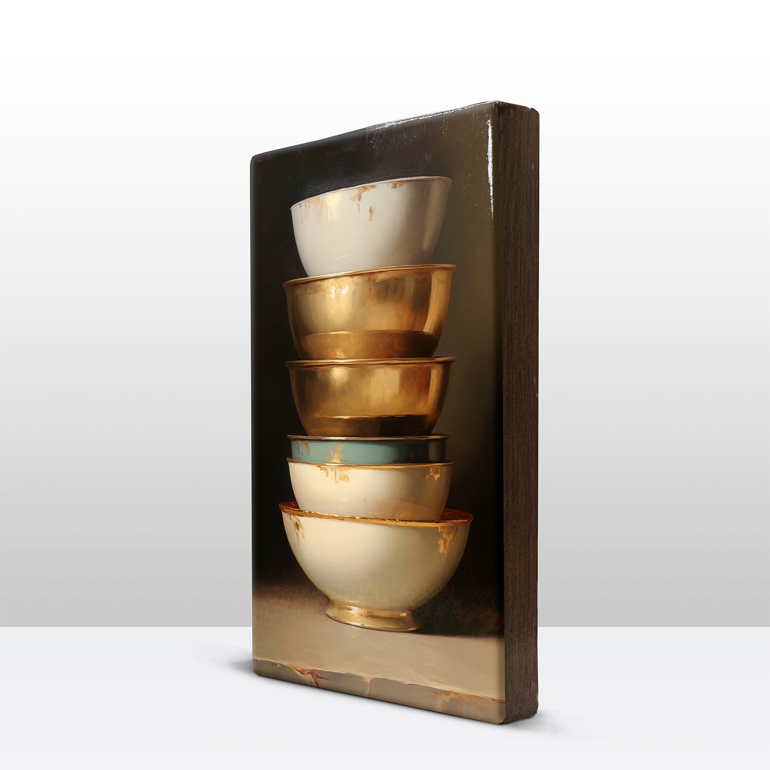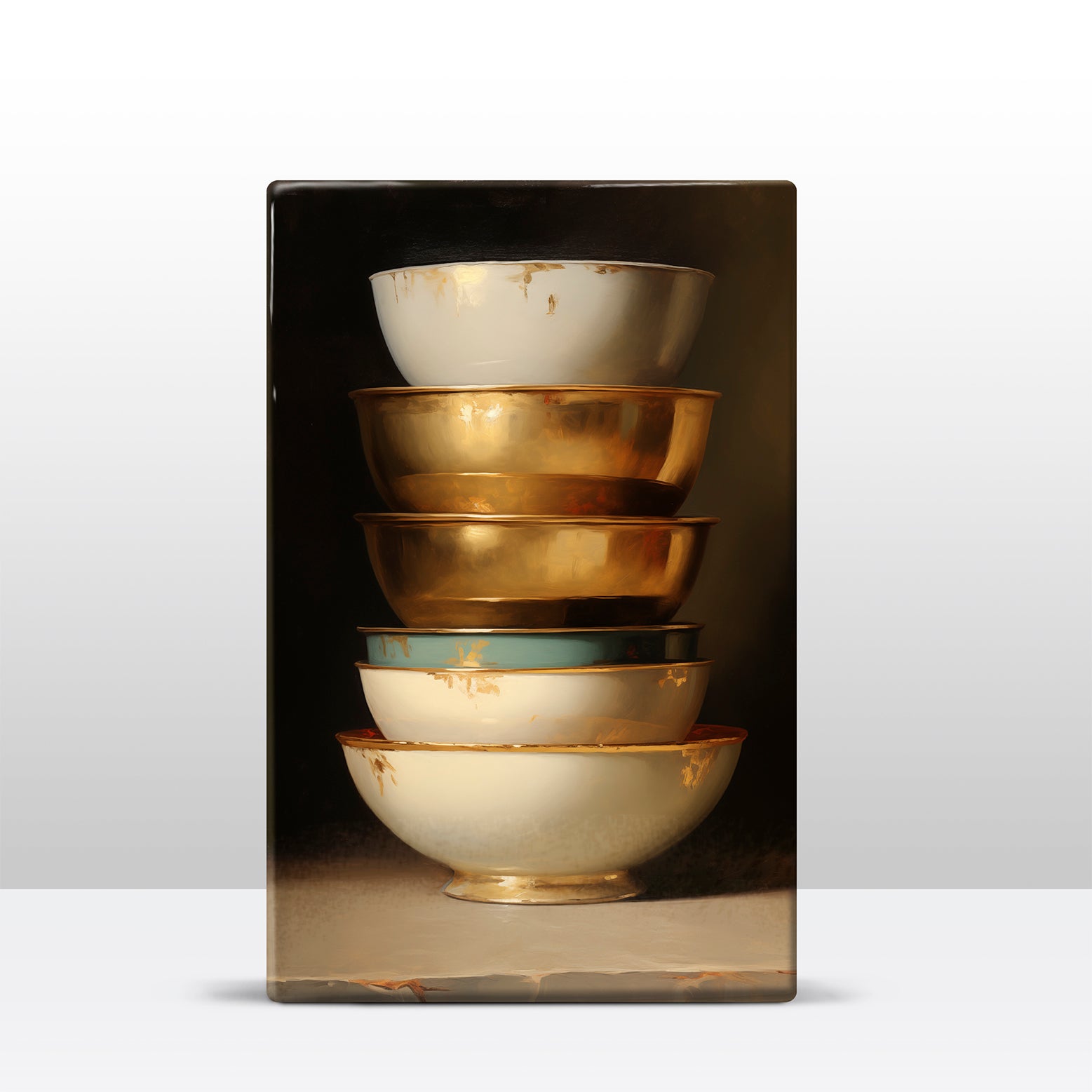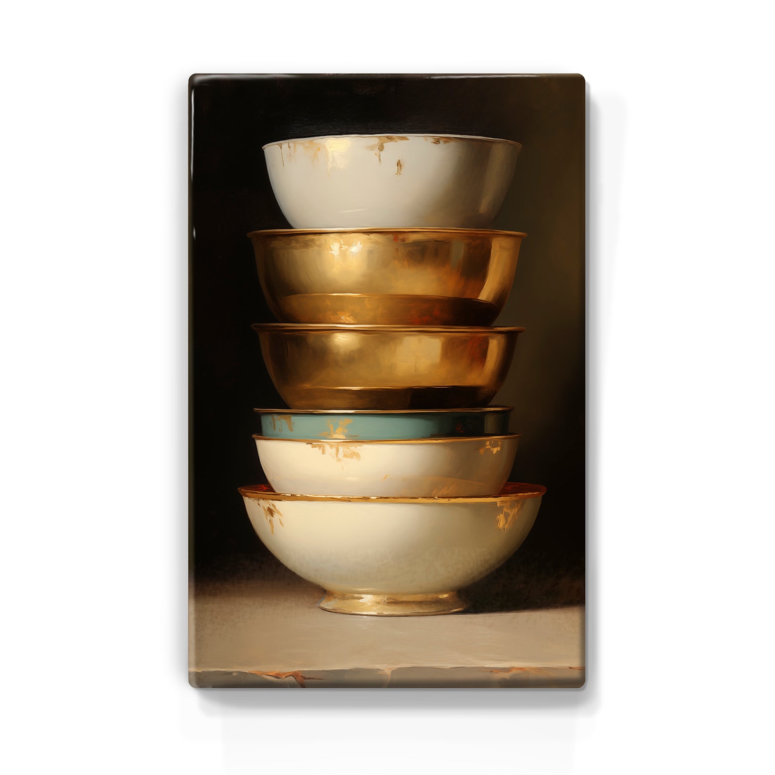 Laqueprint schilderij "Stapel kommen Goud - Wit 3"